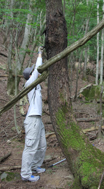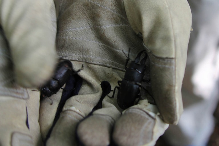 久し振りに息子と二人で山行き。 自動車学校とトロンボーン合宿の谷間で、たまたま身体が空いていたようです。 息子とはこの記事以来なので、5年振りということになる。 場所は以前Danjiriguyさんに教えてもらった場所ですが、ここの木はほとんど電柱クヌギで、しかも樹液の出が高い位置にあり、目の悪い私では発見すら出来ません。 ですから、よい写真を撮ることもできず、仕方なく敬遠していたのですが、背の高い息子を頼りに出かけたのでした。 ![]() 高すぎて、そのままキレイにめくれも残っており、全体としてはとてもイイ感じ。 ![]() と、息子でもこんなカンジです。 諸先輩方も手出しできないのか、幹の頃程良い辺りに猪の擦り跡のような「ケリ跡」がついており、それを目印に我ら親子も蹴っていきます。 ![]() 「お、なんかおる」と息子に言われても、親父の視力では認識できません。 息子が網ではたき落としたりして、小振りながらノコほ3ペアほど確認いたしました。 ![]() 私より13pも高いので、頭上の隙間にも手が届き<どんどん出してくれますが、コクワばかりです。 ![]() 暑くなってきたので、標高を上げて向かった2番目の場所では予想外のボウズを喰らい、様子を確認がてら行った3カ所目で、ノコやミヤマを確認出来ました。 ![]() ノコ♀お見合い写真 ![]() 頭だけ隙間に突っ込んで隠れたつもりになっているミヤマの♀(巨大) この林でクロカナブンを捕獲。 会社の同僚のために、テイクアウト。 こいつがたぶん今期最初で最後のお持ち帰りとなるでしょう。 ![]() 幾度となく山に行きますが、やっぱり息子と一緒に行くのが一番楽しいですね。 野球をする方の、息子とのキャッチボールに相当するのが我ら親子の「虫採り」だと思います。 Danjiriguyさんありがとうございました。 |