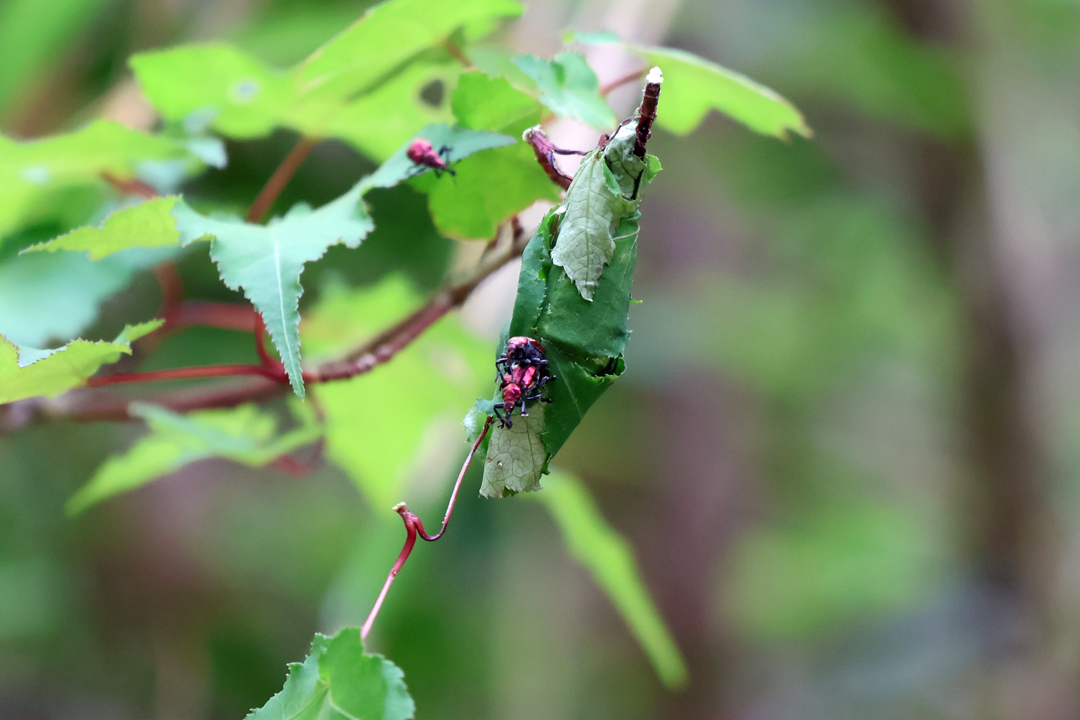 カエデの葉を巻いて「葉巻」状の揺籃(ようらん)を作り、中に卵を産み付けるオトシブミの仲間。