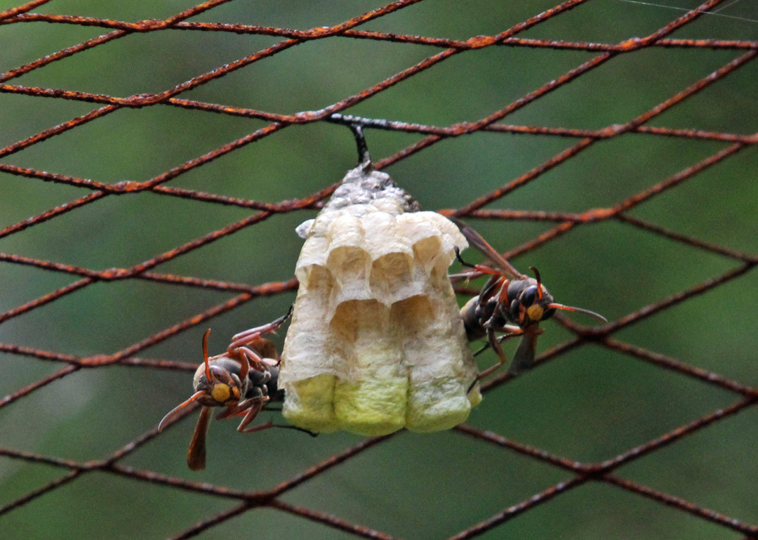 成虫は全体に暗褐色というかブラックブロンズ色というか、渋い色合いなのに、巣の蛹のフタのところは鮮やかな黄緑色で、巣自体が目立ちます。