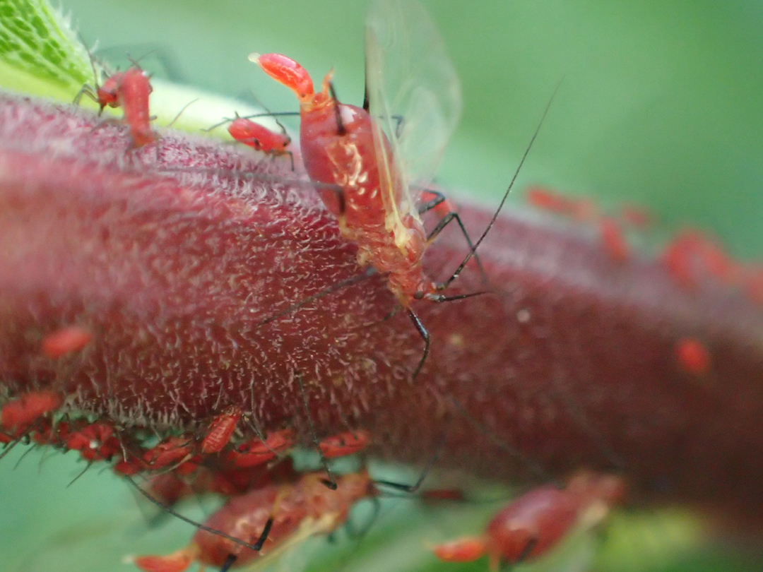 最近やってきた外来種のようで、この赤いアブラムシは時々見かけるようになりましたが、翅があるはたぶんこの日初めて目にしました。