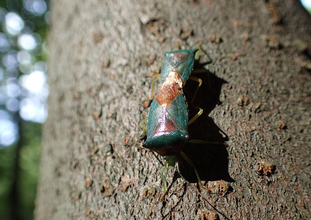 全体がグリーンで小楯板がオレンジの、きれいなカメムシ。
