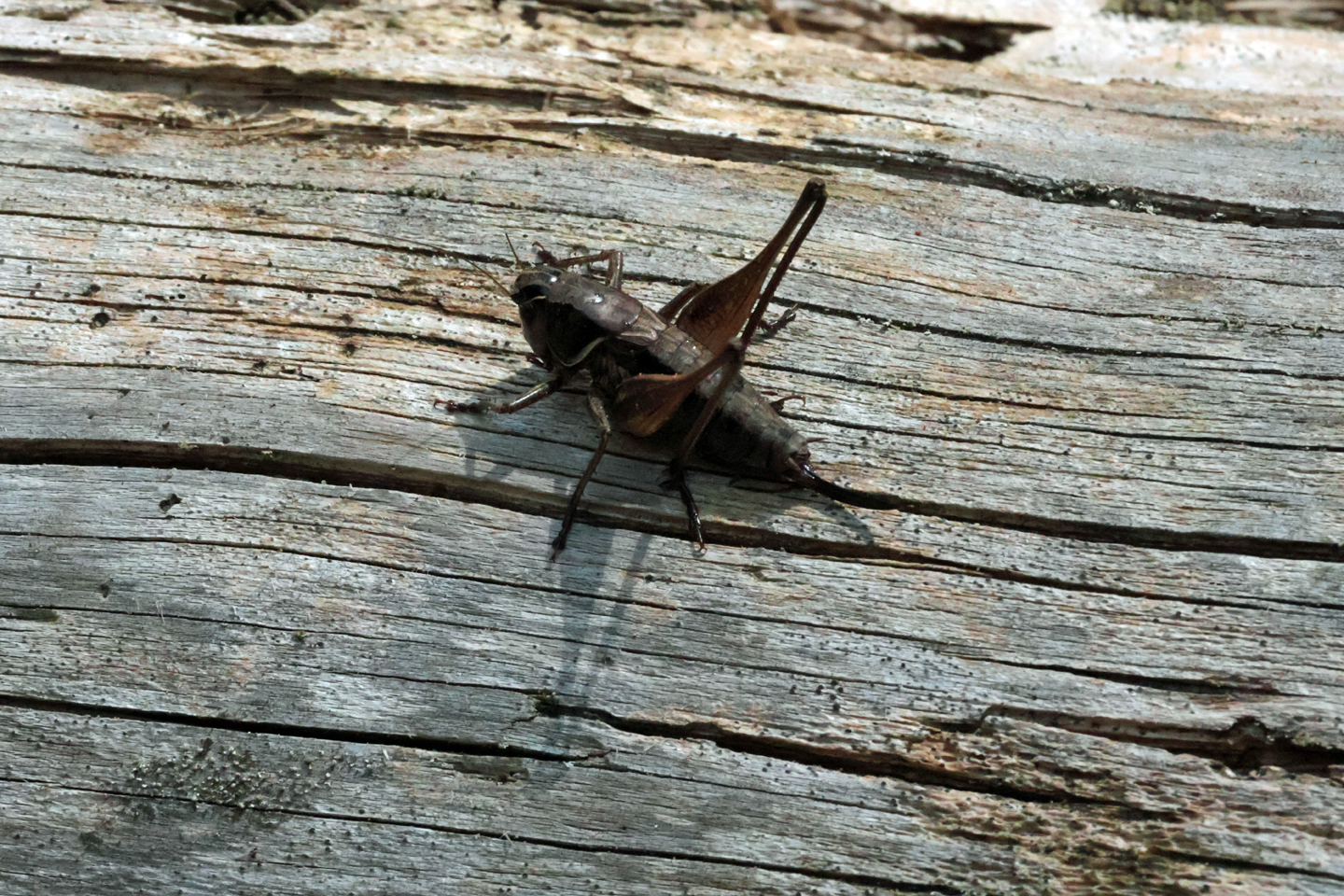キリギリスに似ていますが、全身黒褐色で翅が短い。