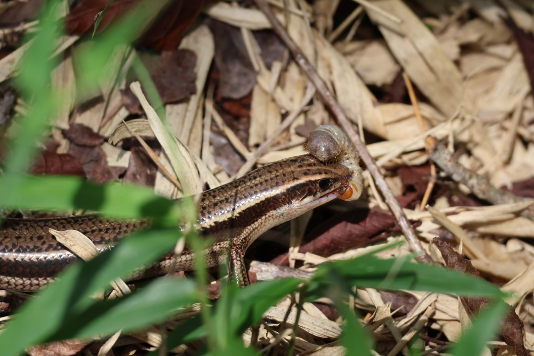 何か甲虫の幼虫でしょうか、獲物をゲットしてご満悦のニホントカゲ。